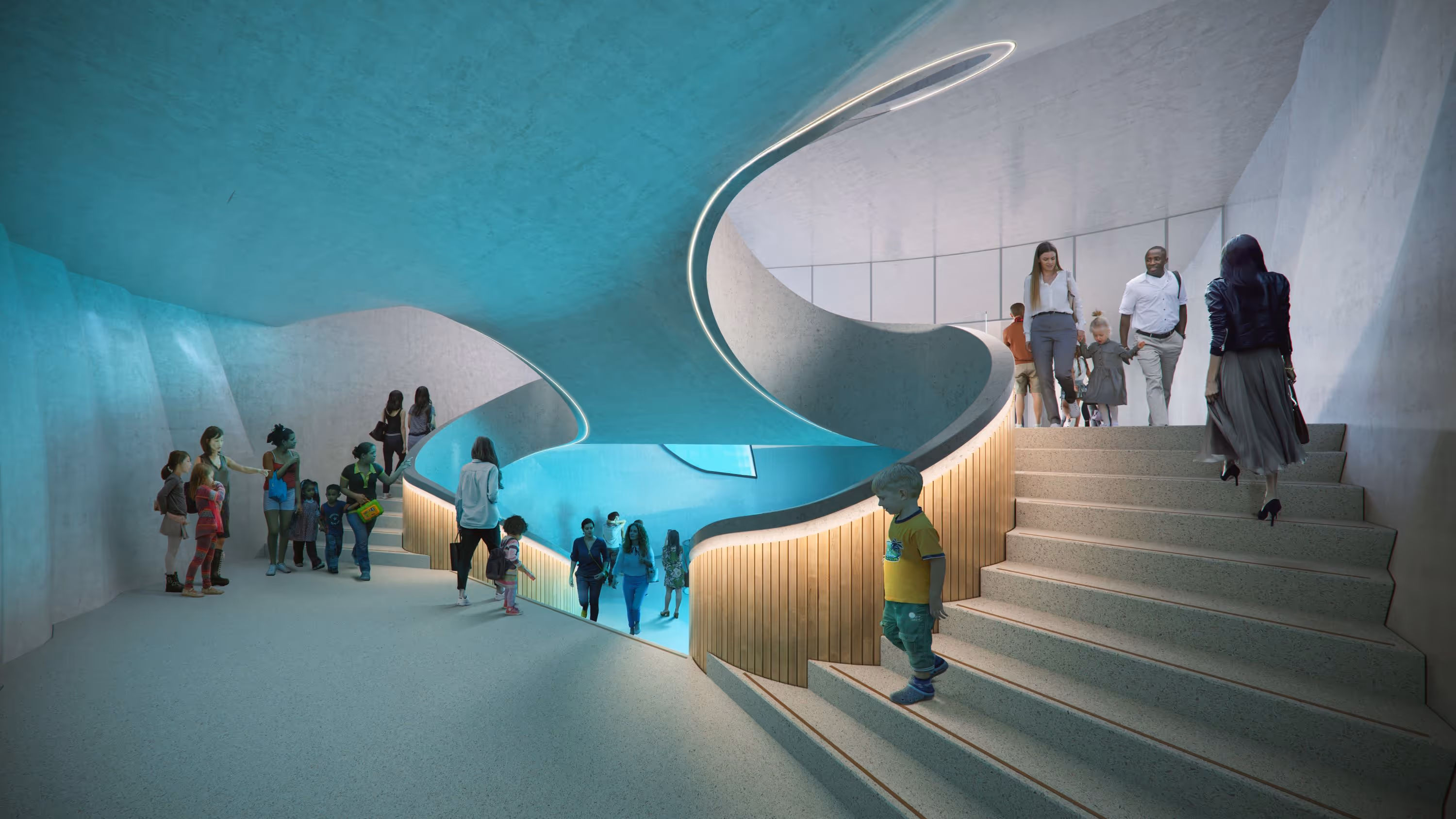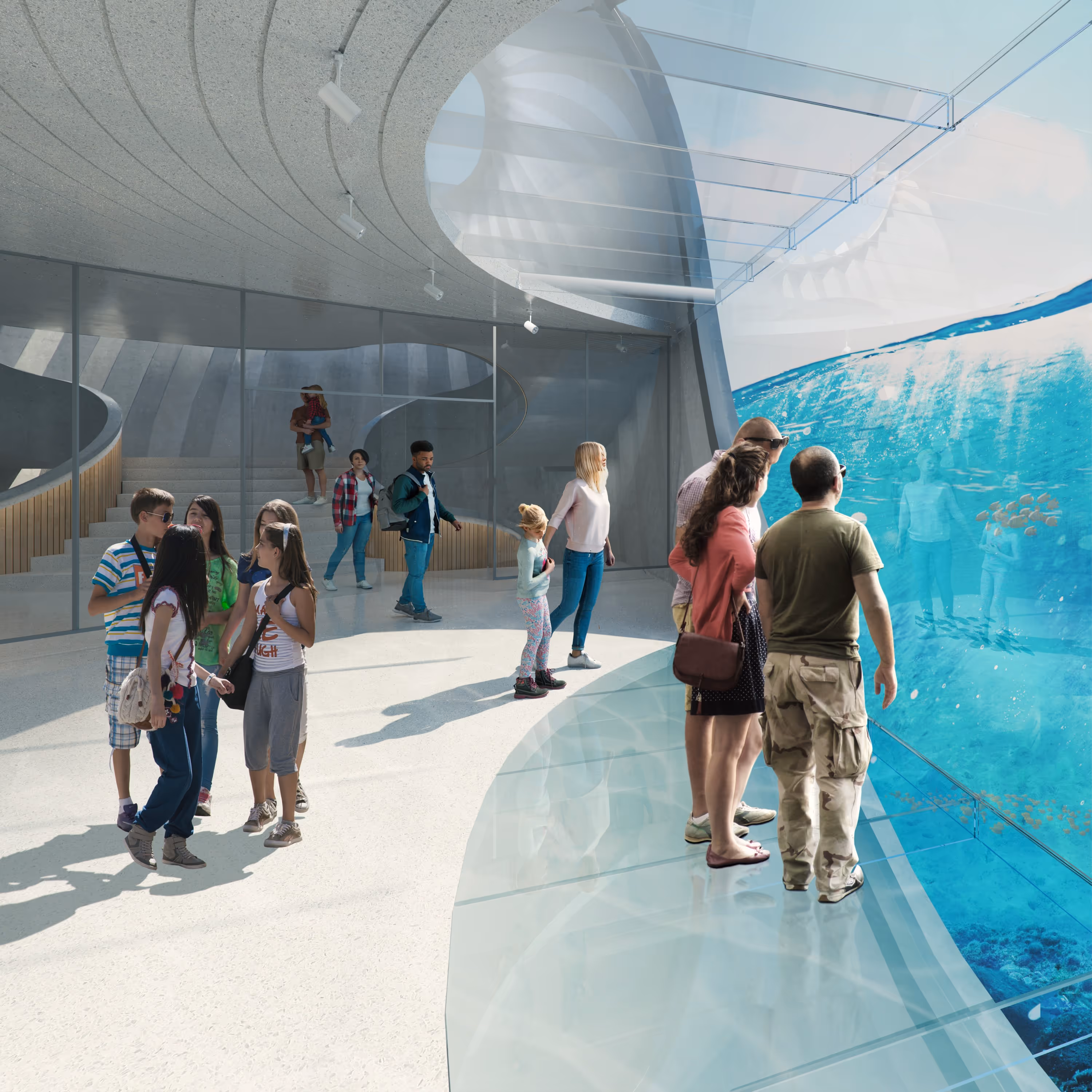 Emerging elegantly from the Busselton Jetty, the AUDC guides visitors through a gradual descent from land to ocean. Inside, a sculptural stairway leads to a submerged observation chamber where curved walls and panoramic windows reveal the underwater landscape of Geographe Bay. Beyond this lies an underwater dining venue, creating an experience that unites architecture and marine life in a seamless encounter.