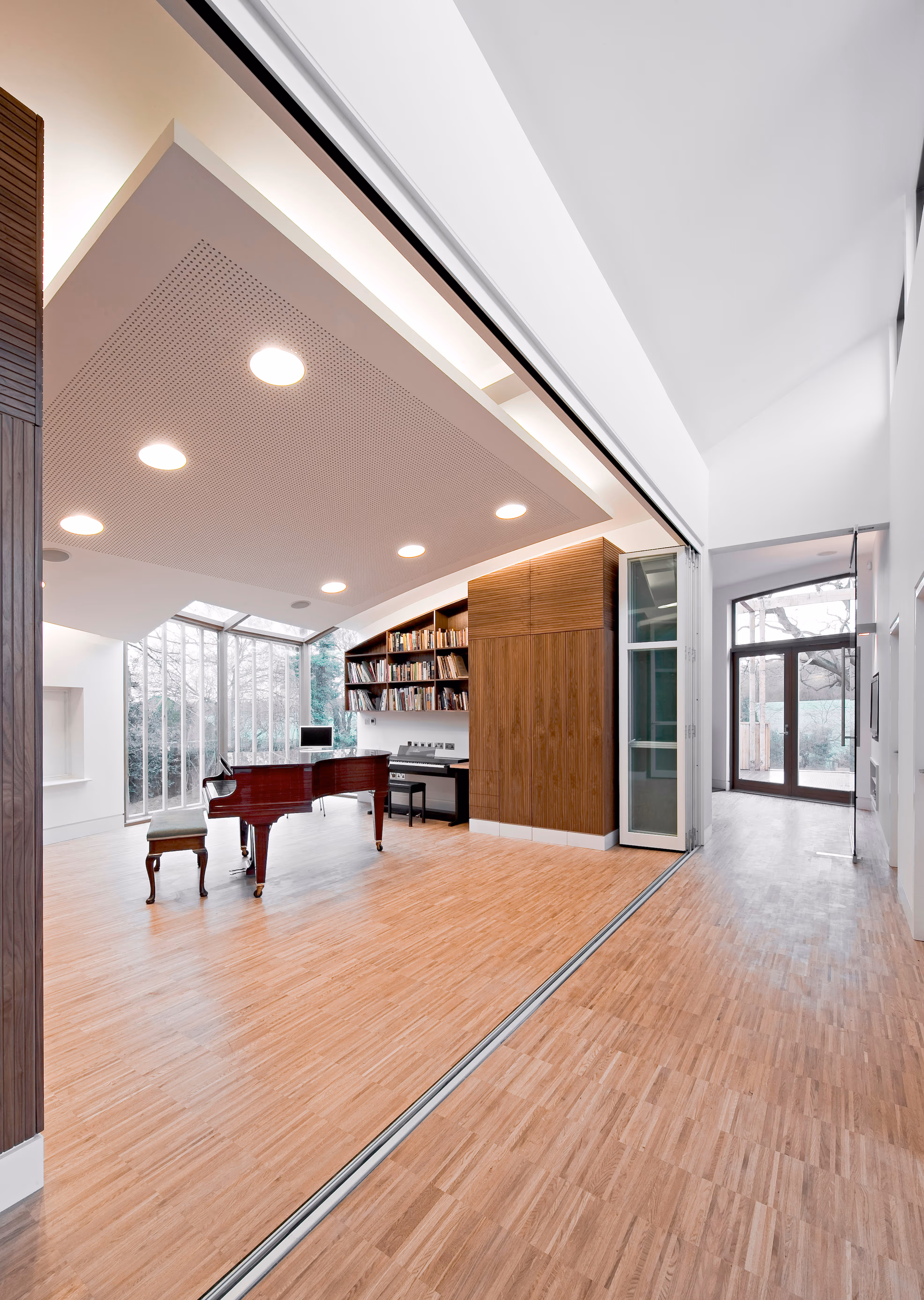 Behind that lies a carefully conceived home that inverts its layout: living spaces occupy the upper volume, while quieter areas, such as the library and bedrooms, lie below.